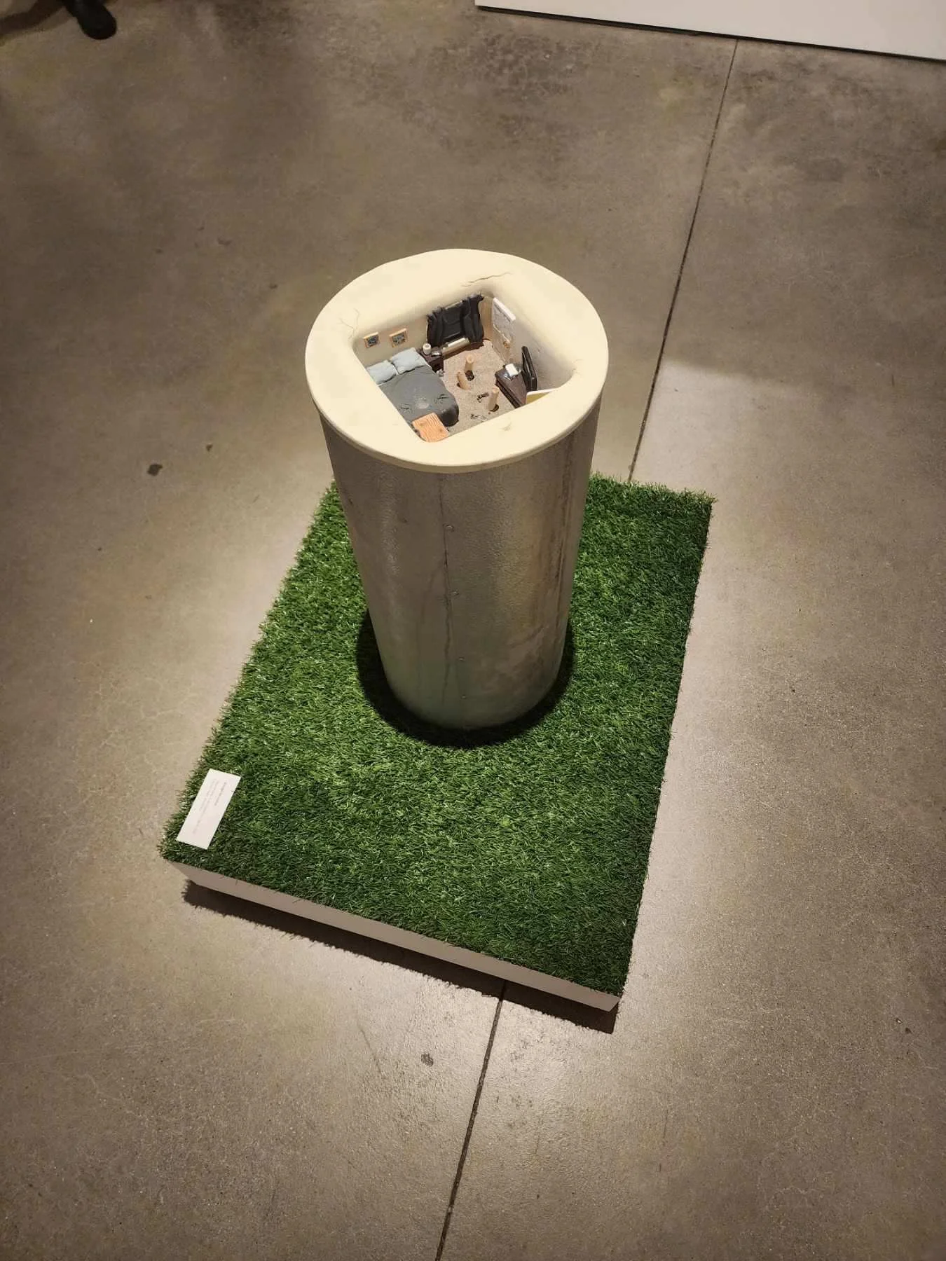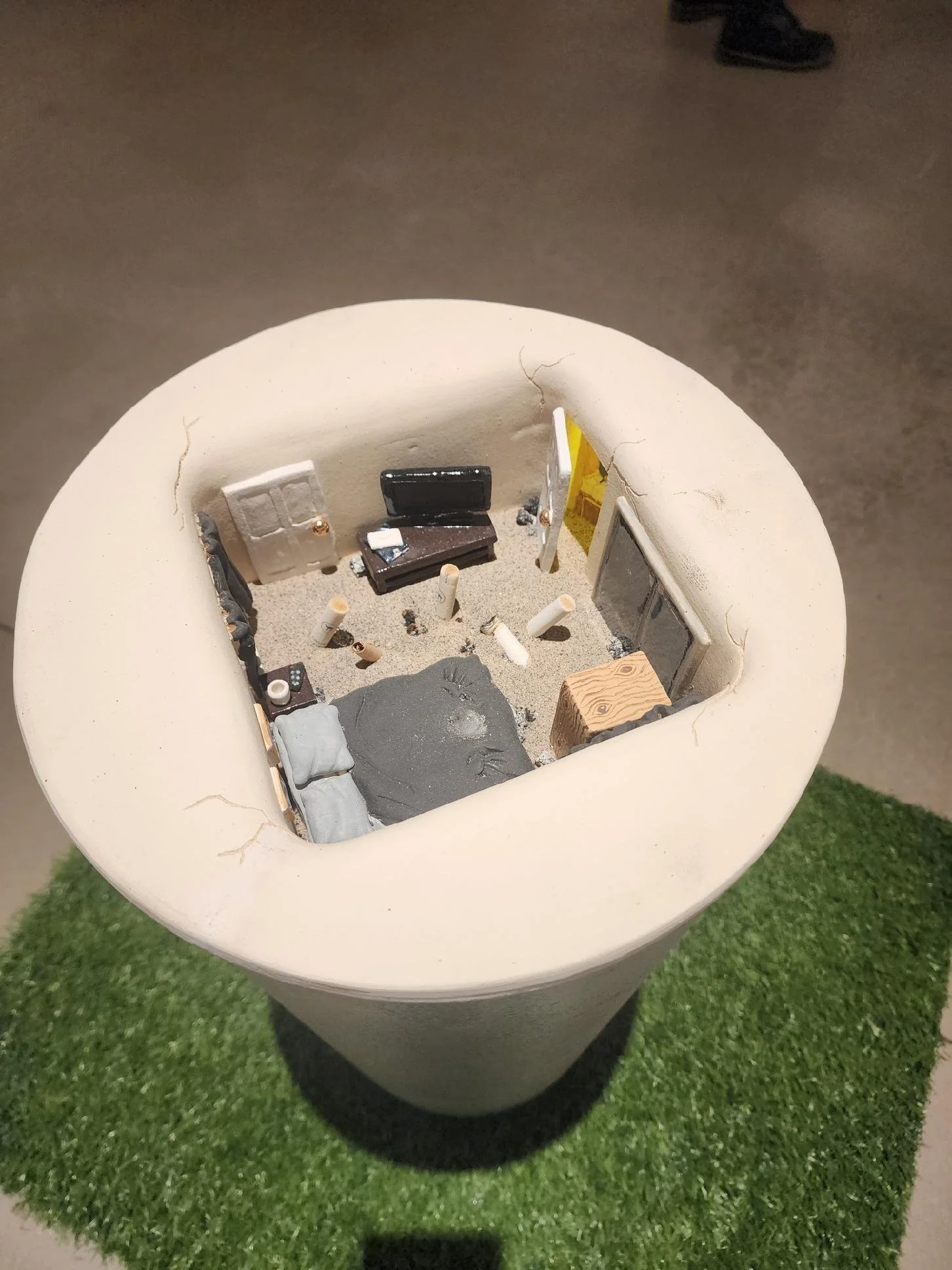 Three Months in the House of a Rapist is a life sized ceramic ashtray of a shrunk down domestic space. Inviting viewers to spend time with the piece through the social activity of smoking, one can find many hidden details that play a role in the story of this room.